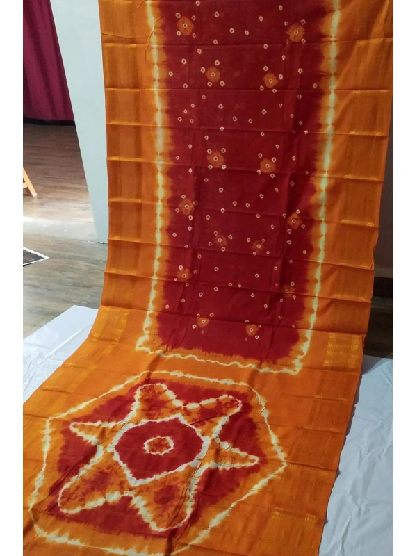 Homepage Our Shop Sungudi Sarees Pattern Sungudi Sarees A rich dual-tone palette of deep crimson red and warm ochre orange, accented by a distinctive white tie-dye transition -SCS00301