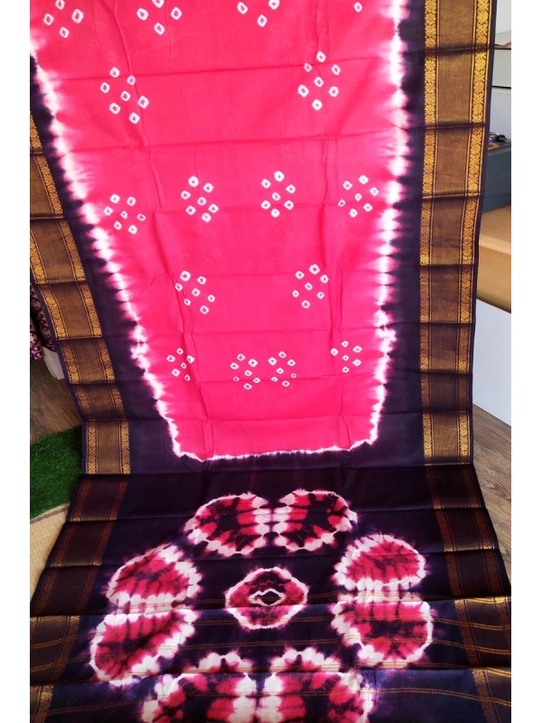 Homepage Our Shop Sungudi Sarees Pattern Sungudi Sarees A rich Golden Zari border with intricate floral (Butti) motifs and horizontal pinstripe detailing -SCS00241