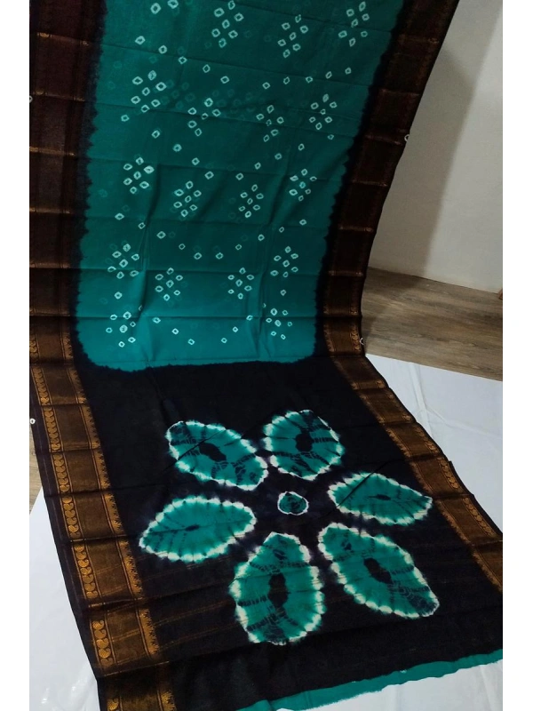 Homepage Our Shop Sungudi Sarees Pattern Sungudi Sarees A vibrant Teal Green body that transitions into a deep Black border and pallu through a soft, tie-dyed gradient -SCS00251