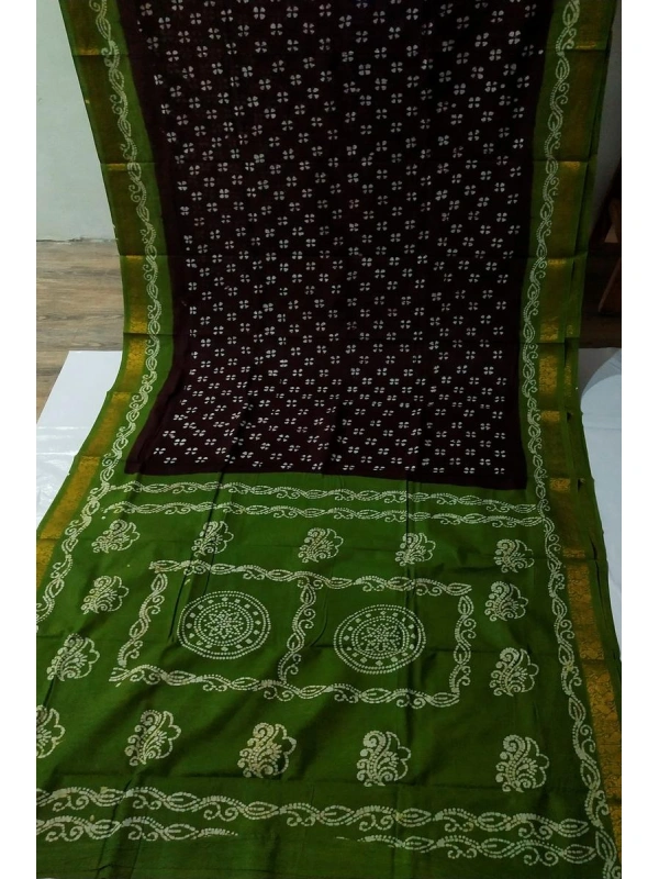 Coffee Brown & Olive Green Hand-Block Batik Cotton Saree