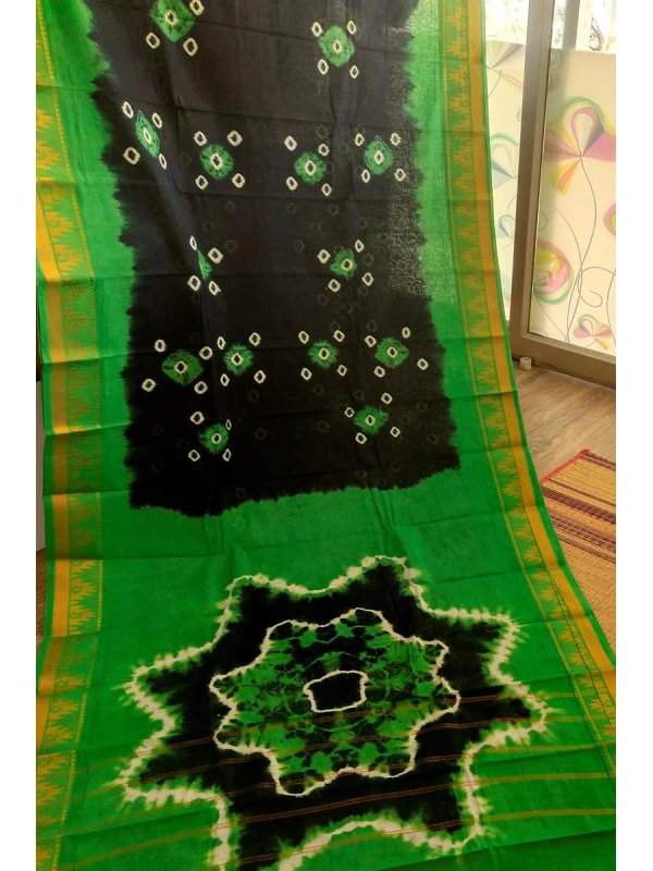 This saree features Shibori-style bleed transitions between the green and black sections, along with traditional Bandhani (tie-dye) motifs -SCS00231