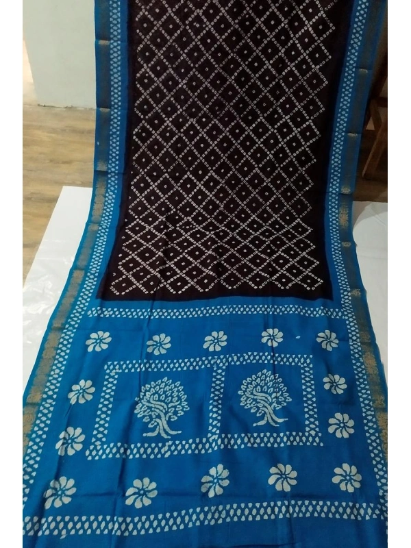 Midnight Black & Cerulean Blue Hand-Block Batik Cotton Saree